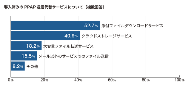 セキュリティリスクが高いことを背景に「PPAP」廃止に向けた機運が高まる中、国内企業でダウンロードサービスへの移行が進んでいる現状を示しているといえます。