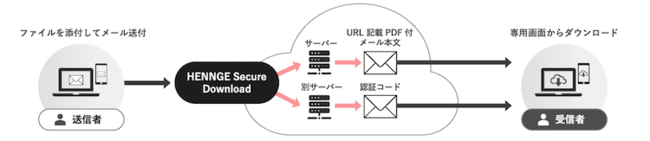 HENNGEが2021年10月にリリースした、クラウドセキュリティサービス「HENNGE One」の脱PPAP機能です。送信者はこれまで通りファイルをメールに添付して送るだけで、ファイルが自動的にクラウドストレージにアップロードされ、受信者には本文と、ダウンロードURLが記載されたPDFが届きます。受信者が自身のメールアドレスの認証をリクエストすると、認証コードが別経路で送信されます。受信者ごとにダウンロードURLを発行するため、受信者だけが認証を行い、ファイルをダウンロードできます。また、万が一誤ったファイルを添付しても、送信後にURLの無効化ができます。