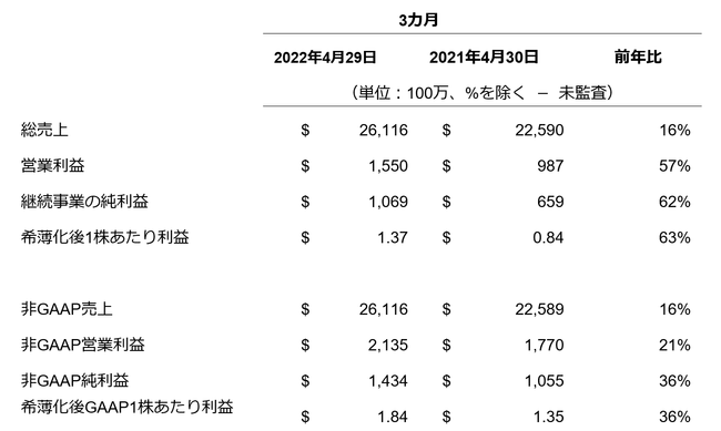 ・営業利益は前年同期比57%増の16億ドル、非GAAP営業利益は同21%増の21億ドルで、いずれも第1四半期として過去最高