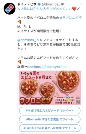 3サイズの「ラブロニピザ」発売を記念して、M、R、Lのそれぞれのサイズにふさわしい愛のエピソードを投稿いただくと「ラブロニピザ」が当たるフォロー&ツイートキャンペーンを行います。