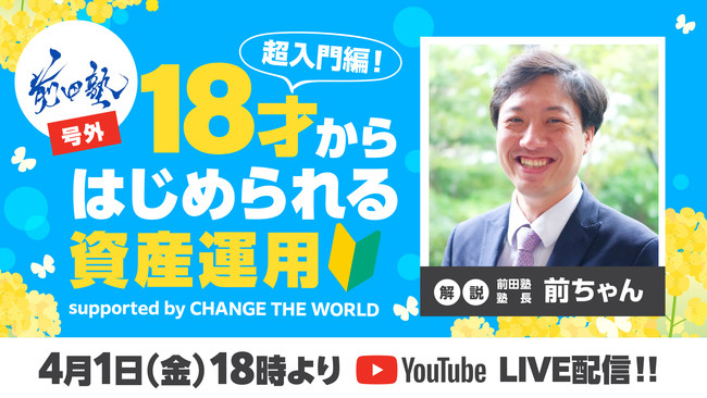 株式会社チェンジ・ザ・ワールド(本社:山形県酒田市 代表取締役:池田友喜)は、株式会社レゾナンス(本社:東京都中央区 代表取締役:前田恵一)と合同で、4月より新成人となる18才以上の若者が知りたい投資に関する基礎知識をゼロから学べる番組「前田塾号外 18才からはじめられる資産運用-超入門編-」を4月1日(金)18:00より、YouTubeでLive配信することを決定いたしました。