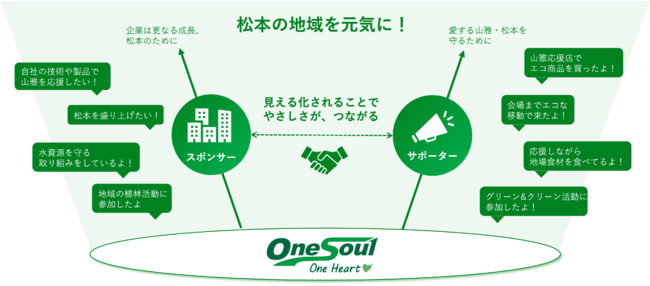 松本山雅FCのキーメッセージ「One Soul, One Heart」とリンクした、「One Soul, One Heartでみんなのやさしさを可視化する」をテーマに、「松本山雅エコ活アプリ“ゼロカーボンチャレンジ”スポンサープラン」を提案。