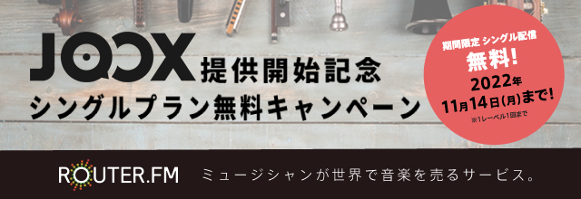 『JOOX』への楽曲データ供給開始を記念して、『ROUTER.FM』では2022年10月31日(月)〜2022年11月14日(月)まで、シングルプラン無料キャンペーンを実施いたします。キャンペーン期間限定で、配信プラン[シングル]の配信登録料(通常1,380円)が、1人1曲無料! 年会費が存在しないため、キャンペーン中にご登録いただいた楽曲は、キャンペーン期間終了後も追加料金なしでそのまま半永久的に配信することが可能です。