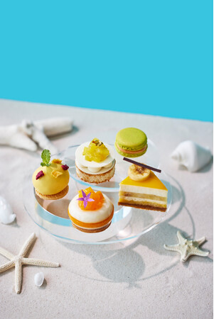 太陽に染まるタヒチへの旅は、クリスピーなサブレに重ねたヴァニラパンナコッタ、マンゴージュレ、フレッシュマンゴーキューブの組み合わせ。エキゾチックなカリブは、パパイヤジュレ、グアバムース、ホワイトチョコレートの協演。モルディブへの冒険は、ベイクドチーズケーキをパッションフルーツのビスキュイ、バナナとパッションフルーツのジュレ、バナナムースのフルーティな要素で仕上げています。