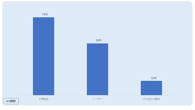 調査結果によると、回答者の大多数(53.9%)が、妊娠線に対して主に外用剤による治療を行っています。次いでレーザー治療が35.9%、その他の治療法は 10.1% を占めています。
