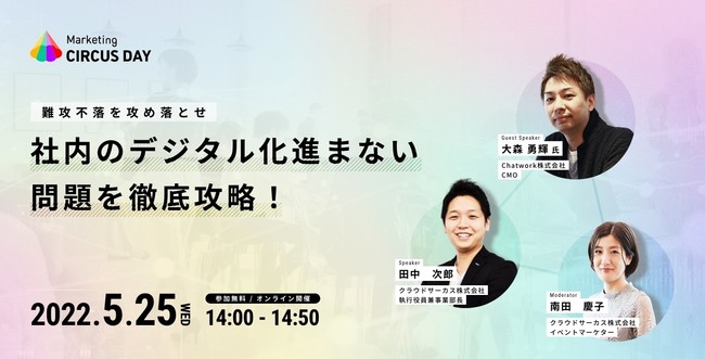 スターティアホールディングス株式会社(本社:東京都、代表:本郷秀之、コード:3393)は、連結子会社でデジタルマーケティング事業を手掛けるクラウドサーカス株式会社(本社:東京都、代表:北村健一)において、「誰も教えてくれなかったデジタルマーケティングの基礎と未来を学ぶ」を大テーマにした無料オンラインカンファレンス『Marketing CIRCUS DAY』を毎月開催することをお知らせします。第1回目となる5月25日(水)は、【難攻不落を攻め落とせ!社内の「デジタル化進まない」問題を徹底攻略!】をテーマに、Chatwork株式会社(本社:大阪府、代表取締役CEO:山本正喜)CMO大森勇輝氏をゲストに迎えます。皆様のご参加お待ちしています。