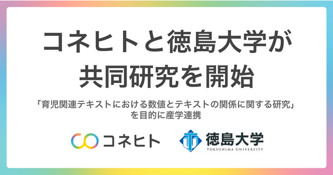 コネヒトと徳島大学が共同研究を開始。「育児関連テキストにおける数値とテキストの関係に関する研究」を目的に産学連携