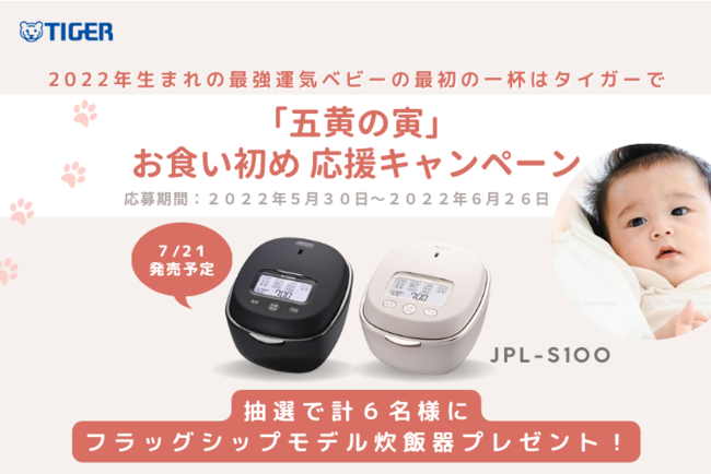 熱制御テクノロジーで世界をリードするタイガー魔法瓶株式会社(社長:菊池嘉聡、本社:大阪府門真市)は、2022年5月30日(月)〜6月26日(日)までの期間、2022年寅年生まれのお子様がいらっしゃる方を対象とした、「五黄の寅 お食い初め応援キャンペーン」を公式SNSアカウントにて開催いたします。