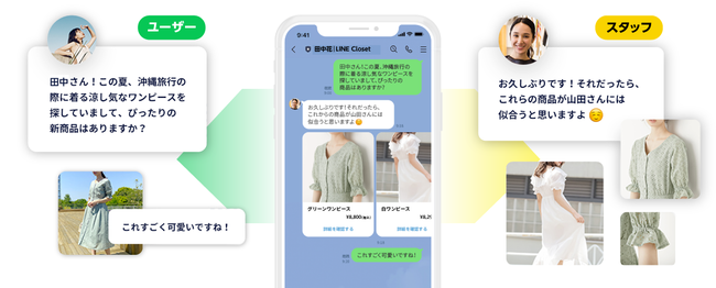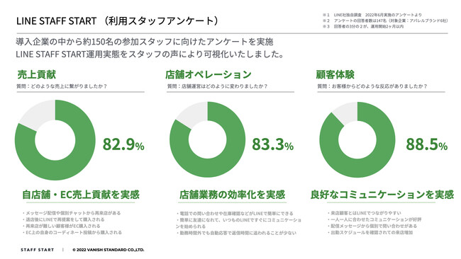 「LINE STAFF START」は、スタッフがユーザーと「LINE」で直接コミュニケーションが図れるサービスです。LINEが提供する個人・法人向けアカウントサービス「LINE公式アカウント」を通して、当社の提供する店舗スタッフの接客をDXするアプリケーションサービス「STAFF START」の機能を活用することにより、商品やコーディネート、キャンペーンなどの情報発信、チャットによるオンライン接客などから、スタッフ個人の売上を可視化することが可能になります。LINE STAFF STARTを利用するスタッフの88.5%の方がお客様との良好なコミュニケーションを実感、あらゆるジャンルで利用が進んでいます。