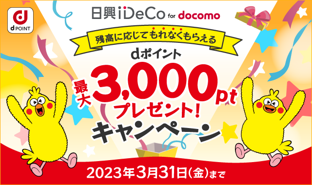 また、「日興iDeCo」および、「日興iDeCo for docomo」の開始を記念し、「日興iDeCo for docomo」をご利用のお客さまに「日興iDeCo for docomo」 dポイント最大3,000ptプレゼント!キャンペーンを実施いたします。