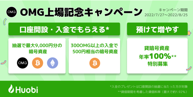フォビジャパン、【最大9,500円相当の暗号資産が 抽選でもらえる !年率100%*の貸暗号資産キャンペーンも!】OMG上場記念キャンペーンを開催