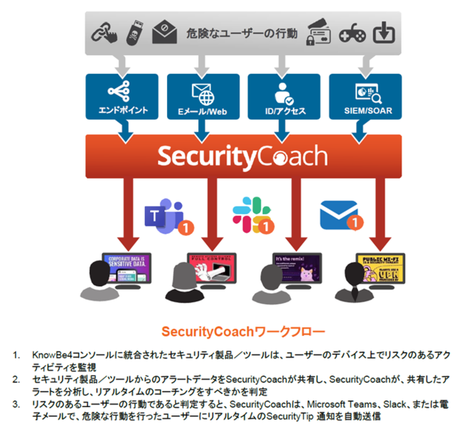 KnowBe4の「SecurityCoach」は、エンドユーザーの危険な行動を伴うセキュリティインシデントをリアルタイムに特定して、危険な行動を行ったユーザーに対してリアルタイムのセキュリティコーチングを実施することで、リスクの高い行動の低減を支援します。