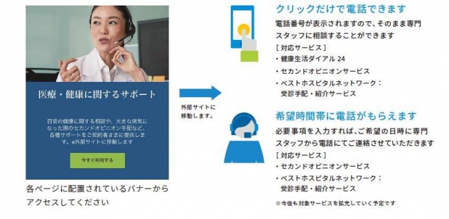このポータルサイトは、お客さまの疾病予防、早期発見、治療、そして治療後のケアに至る、健康管理の各段階においてサポートを実現する包括的なサービス*2提供の一環として、状況に応じて必要な情報や役立つサービスをご案内するものです。具体的には、各段階においてメットライフ生命のご契約者さまが、関心の高い情報コンテンツや、ティーペック社のセカンドオピニオンサービスをはじめとした各種商品付帯サービスへ簡単にアクセスし、利用できます。