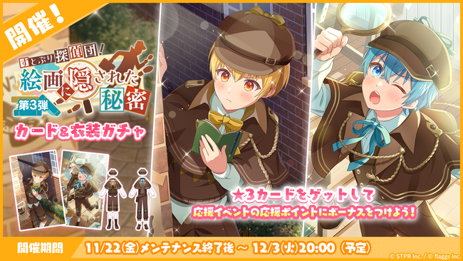 本日11月22日(金)より、新たな★3カードがピックアップ登場する「すとぷり探偵団!絵画に隠された秘密 第3弾 カード&衣装ガチャ」が開催中です。