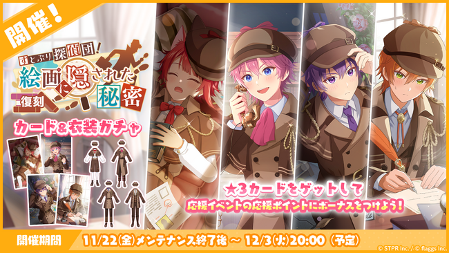 株式会社flaggs(フラッグス)(本社:東京都品川区、代表取締役CEO:吉江 直人)と株式会社STPR(本社:東京都渋谷区、代表取締役:柏原 真人、以下STPR)は、本日11月22日(金)に2.5次元アイドルグループ「すとぷり」の公式ゲームアプリ「すとぷりWith!!(通称:すとうぃず)」のゲーム内イベント「すとぷり探偵団!絵画に隠された秘密 応援イベント」の開催についてお知らせいたします。