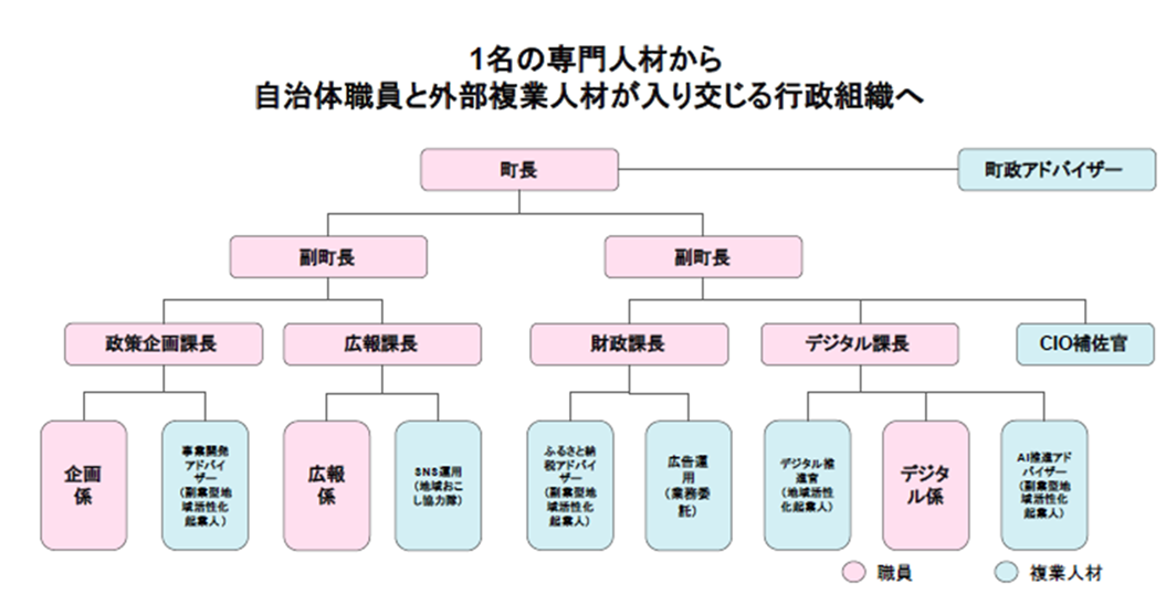 従来の、外部人材がスポット的に行政に関わる形ではなく、公務員と複業人材が、行政組織の一員として共に様々な課題に取り組む次世代型行政組織。