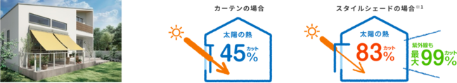 夏場、室内に入ってくる熱の約7割は窓などの開口部からです。カーテンやブラインドは、室内で日差しをカットするため室内まで熱が入ってきて、そのままこもってしまいます。スタイルシェードを取り付けることで、窓から侵入する太陽の熱を約83%※1カットし、室内温度の上昇を抑えることができ、室内熱中症対策だけでなく、夏の節電にもつながります。