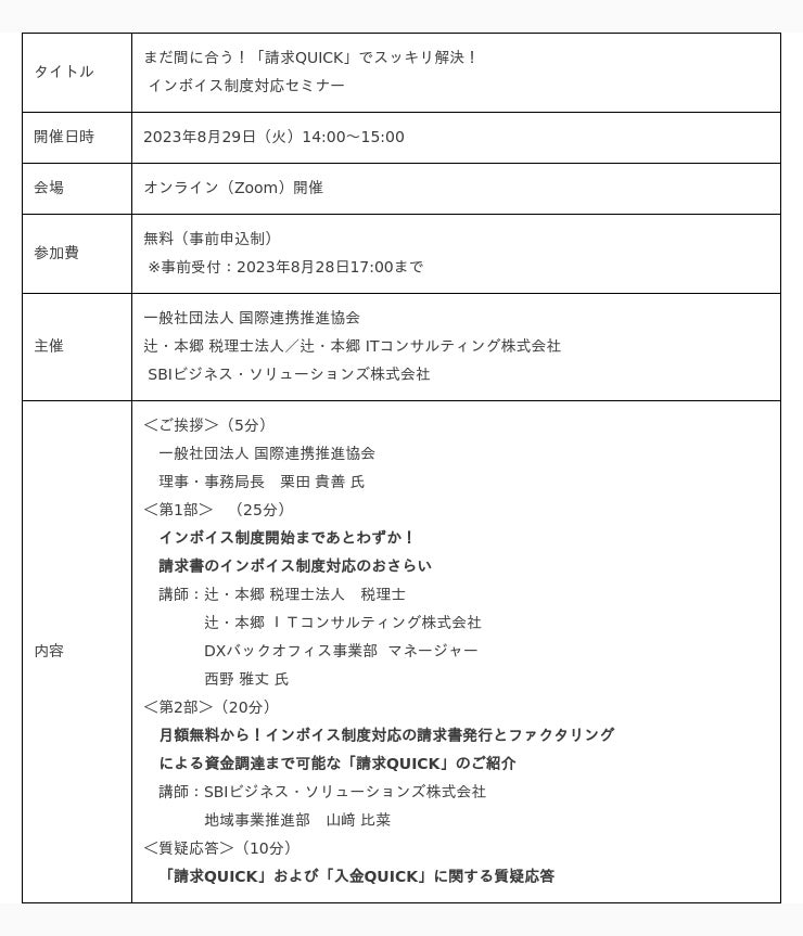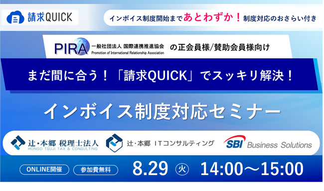 総合フィンテックソリューション企業であるSBI FinTech Solutions株式会社の子会社で、バックオフィス支援サービスを提供するSBIビジネス・ソリューションズ株式会社(本社:東京都港区、代表取締役社長:夏川 雅貴、以下「当社」)は、辻・本郷 税理士法人(本社:東京都新宿区、理事長:徳田 孝司)および、辻・本郷 ITコンサルティング株式会社(本社:東京都新宿区、代表取締役:黒仁田 健、以下「辻・本郷 ITC」)とともに、一般社団法人 国際連携推進協会(所在地:東京都千代田区、代表理事:茅本 良夫、以下「PIRA」)の正会員様/賛助会員様向けに、8月29日(火)に開催される「インボイス制度対応セミナー」に登壇しますので、お知らせいたします。