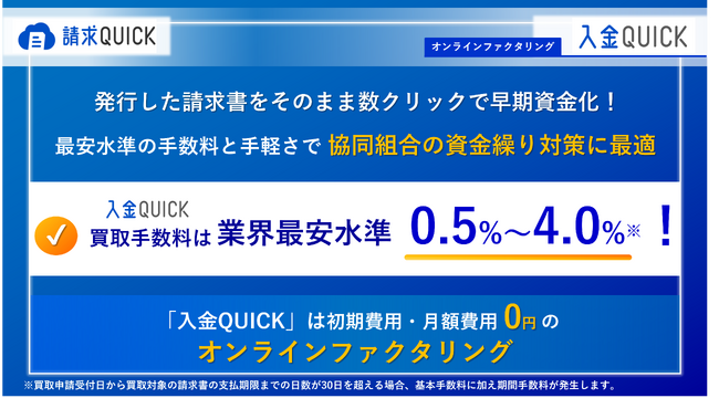 当社が提供する「請求QUICK」は、インボイス制度という直近の課題への対応にとどまらず、経常的な経営課題である資金繰りをサポートするために、「請求QUICK」で発行した請求書をそのまま数クリックで資金化できるファクタリング機能「入金QUICK」を組み込んでいることに大きな特徴があります。こうしたITツールの導入により、法制度対応や業務効率化はもちろんのこと、新しい資金調達手段としての財務DXまで実現できることを、本セミナーを通じて協会員の皆様に直接お伝えし、組合運営の安定と高度化のお役に立てればと考えております。