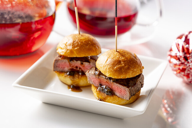 その他にも厚切りのビーフフィレを贅沢に用いた「ビーフステーキバーガートリュフソース添え」や「カリフラワーのスープ」に加え、ホテル1階マーブルラウンジより2種類のスイーツもセットになっており、ランチやアフタヌーンティーとしてはもちろん、少し早めのディナーとしてもご満足いただける内容となっています。ドリンクはカリフォルニア発、上質なオーガニックティーブランドART OF TEAの紅茶を含む20種類をご用意。「クリスマスアップルグリーンアイスティー」や「チョコレートモンキー」などの紅茶もお楽しみいただけます。