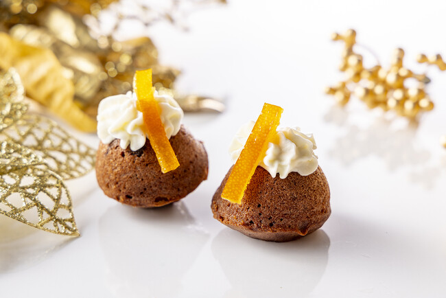 アールグレイの茶葉を練り込んだブリオッシュ生地の中に、アールグレイの香りを移したシロップで煮たドライアプリコットを忍ばせた『ホワイト・オーナメント』、クリスマスジンジャークッキーで用いるシナモンやカルダモン、ジンジャーなど6種類のスパイスを練り込みドライクランベリーと共に焼き上げるショコラ風味のマフィン『キャンドルライト』、たっぷりのクリームとオレンジピールと一緒にご賞味いただけます。