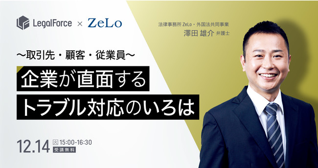 AI契約審査プラットフォーム「LegalForce」、AI契約書管理システム「LegalForceキャビネ」を提供する株式会社LegalForce(本社:東京都江東区 代表取締役:角田望、以下LegalForce)は、2021年12月14日(火)15時から16時半まで、無料のオンラインセミナーである「これでもう怖くない!企業が直面するトラブル対応のいろは〜取引先・顧客・従業員〜」セミナーを開催します。