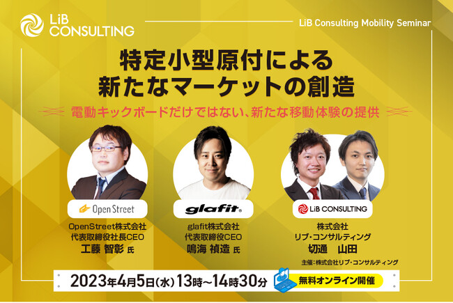 株式会社リブ・コンサルティング(本社:東京都千代田区、代表取締役:関 厳)は、2023年7月1日から改正道路交通法が施工される背景を受けて、特定小型原付市場への参入検討企業様・シェアリングビジネスについて興味がある企業様を対象とした、「特定小型原付による新たなマーケットの創造」セミナーを2023年4月5日(水)に開催いたします。