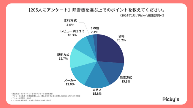 除雪機を選ぶポイントとして、特に多かった回答は「価格」「除雪方式」「大きさ」でした。