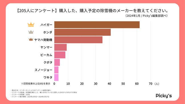 「Picky’s」は、インターネットショッピングにおいて、購入前に試せない・選ぶべきものがわからないという課題の解決を目標に、あらゆる商品のおすすめランキングや検証レビューを紹介するサイトです。このたびPicky’s(https://rentry.jp/)では、除雪機についてインターネット上でアンケート調査を行いましたので発表いたします。