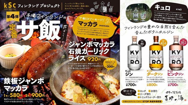 総合エンターテインメント企業・キスケ株式会社(本社:愛媛県松山市、代表:山路義則)が運営する「伊予の湯治場 喜助の湯」では、事業部長が本場フィンランドでサウナの本質を学び、体験して来たことを具現化するためのフィンランド サウナ プロジェクト 第4弾として、フィンランドの人々の食文化を体験できるように、「マッカラ」と、世界1位に輝いたフィンランド産のKYRO GIN(キュロ ジン)を新メニューとして採用しました。