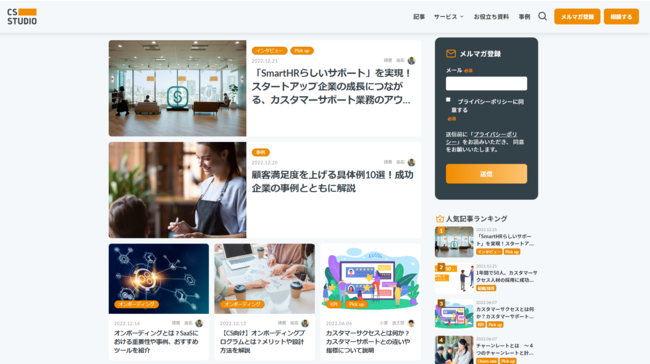 先進的なカスタマーサクセスの取り組みを行う企業へのインタビューをはじめ、カスタマーサクセスのKPIやカスタマーサクセスにつながる組織/採用など、様々なテーマの記事を掲載しています。今後は、海外の最新のカスタマーサクセスに関するニュースなども紹介していきます。