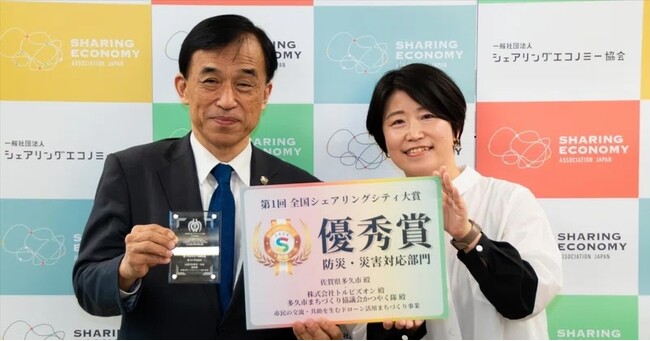 ドローン空路整備事業を展開するトルビズオン(本社:福岡市中央区 代表取締役 増本 衛、以下「トルビズオン」)は、佐賀県多久市、多久市まちづくり協議会かつやく隊と共同で取り組んだ『市民の交流・共助を生むドローン活用まちづくり事業』が評価され、2024年5月15日に開催された「全国シェアリングシティ大賞」表彰式で、防災・災害対応部門の優秀賞を受賞しました。