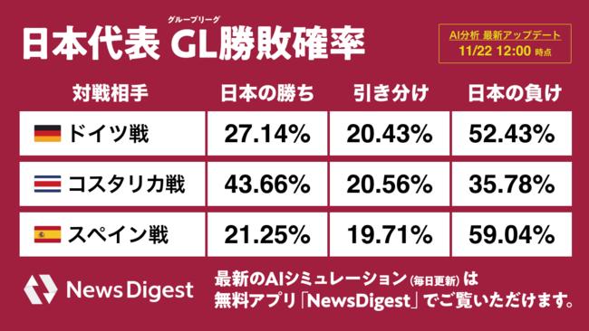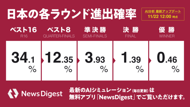 22日12時時点で、日本のグループリーグ突破確率は33.4%、優勝確率は0.5%となっています。わかりづらいサッカーの優劣も、数字に変換することで容易に理解できます。