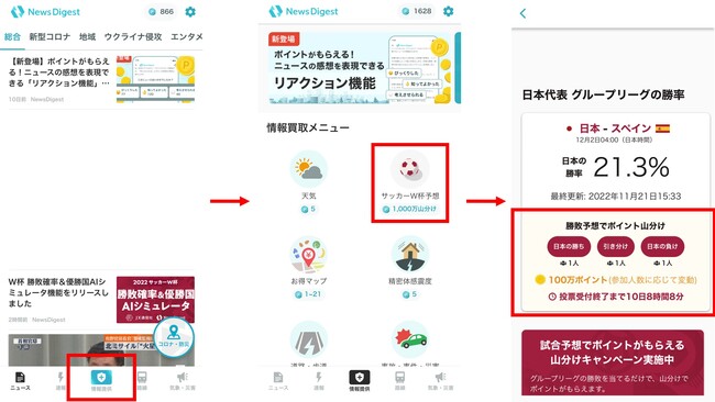 キャンペーンには、当社が提供する「2022サッカーW杯 勝敗確率&優勝国 AIシミュレータ」に、「NewsDigest」からアクセスすることで参加可能です。下部の「情報提供」ボタンを押し、「サッカーW杯予想」からページに遷移すると、日本代表の「勝ち」「負け」「引き分け」を予想するボタンが押下できるようになります。