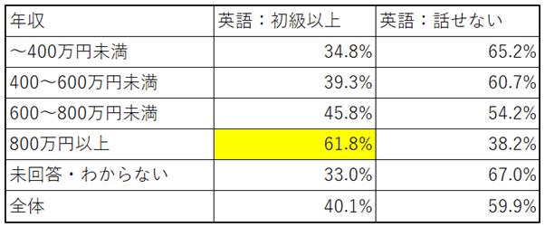 一方、年収400万円未満は34.8%、400〜600万円未満は39.3%、600〜800万円未満の人は45.8%が初級以上となっており、英語力と年収の関係が見られる結果となっています。