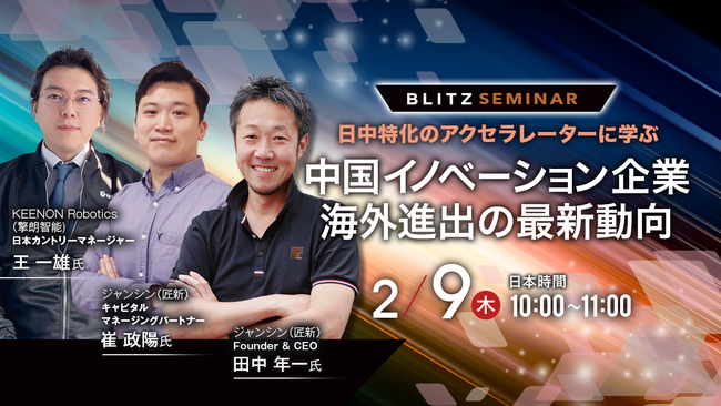 TECHBLITZ主催のオンラインセミナーシリーズ「BLITZ SEMINAR」。今回はTECHBLITZのコンテンツパートナーであるジャンシン(匠新)のCEO田中年一氏と同社投資事業責任者の崔政陽氏をお招きし、中国スタートアップから大企業までを対象とする中国イノベーション企業の海外進出における最新動向についてお話しいただきます。