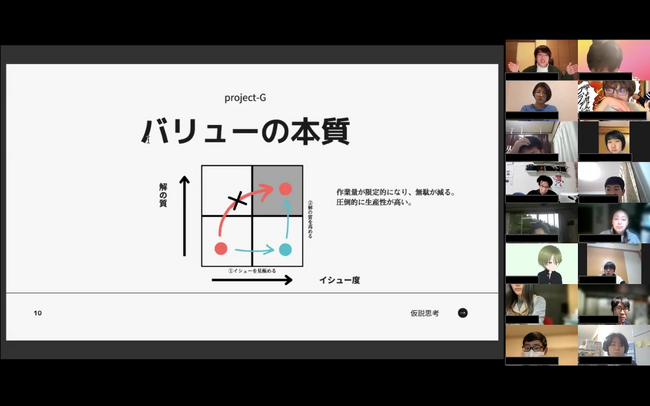 2月のプロジェクトキックオフからこれまで全5回の講義を経て、各チームでIT企業の新商品・新事業のビジネスプランを練ってきました。各講義は毎週金曜日19:30〜21:00にオンラインで開催され、N高等学校の生徒によるビジネススキル向上や思考力を高める講座や、うち2回はブイキューブの社員も登壇し、ブイキューブをモデルケースとして事業について解説を行いました。参加者の各チームは講座を受けながら、ビジネスプランを磨き込んできました。