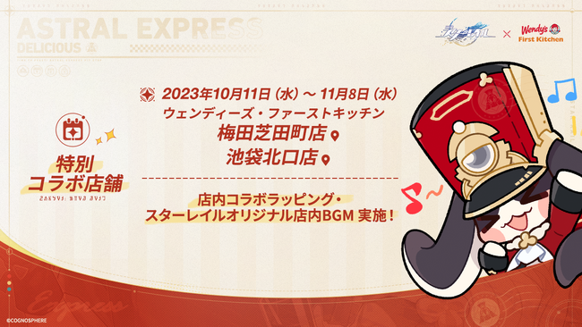 ウェンディーズ・ジャパン株式会社及び、ファーストキッチン株式会社(所在地:東京都新宿区、代表取締役:紫関修)は、ウェンディーズ・ ファーストキッチンとファーストキッチン(競馬場店を除く)で、10月11日(水)よりスペースファンタジーRPG『崩壊:スターレイル』とのコラボキャンペーンを開催します。コラボを記念して、1,300円(税込)毎お買い上げのお客様に、「崩壊:スターレイル コラボ特典チケット Ver-三月なのか/Ver-丹恒(シリアルコード付き、キャラはランダム)」&「崩壊:スターレイル コラボバッジ Ver.パム」各1つを、11月8日(水)までの期間中、数量限定でプレゼントします。また、「崩壊:スターレイル デザイン入りポテト」を期間限定で販売します。 数に限りがありますので、なくなり次第終了となります。何卒ご了承ください。 さらに!2店舗限定で特大パネルの設置やスターレイルオリジナルBGMを放送します。ぜひご期待ください。
