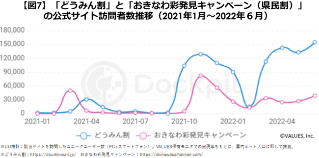 「どうみん割」と「おきなわ彩発見キャンペーン(県民割)」の公式サイトのユーザー数推移を見てみると【図7】、2022年夏に向けて「どうみん割」の増加が大きいことがわかります。沖縄では当県民限定なのに対し、北海道では道民に加え、東北6県在住者も対象者となっていることや、乱立する「県民割」の中で目立つキャンペーンタイトルであることなどが、訪問者数の増加に影響していそうです。