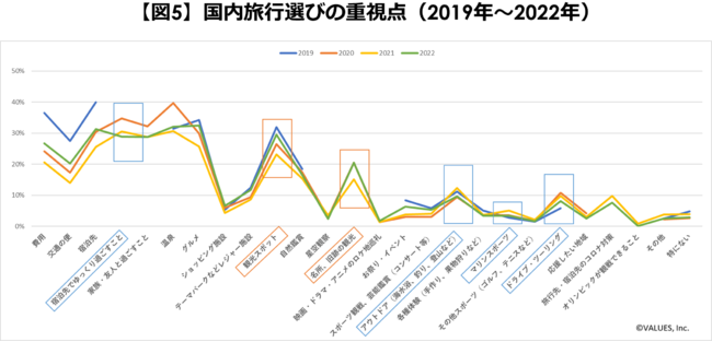 国内旅行選びの重視点【図5】も、コロナ前後で変化してきているようです。宿泊先でゆっくり過ごすこと、アウトドア、マリンスポーツ、ドライブ・ツーリングを重視する人の割合は、2022年になって減少しています。一方で、観光スポットの重視度は2019年水準まで高まっており、密を避けた旅行から、定番の観光地への回帰が起こっているのかもしれません。