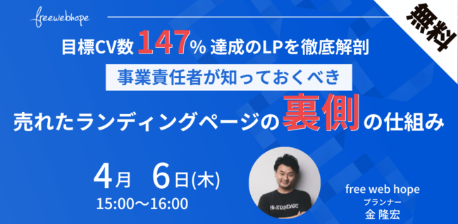 株式会社free web hope(本社:東京都中央区、代表取締役:相原ゆうき)は、無料のオンラインセミナー「目標CV数147%達成のLPを徹底解剖!事業責任者が知っておくべき売れたランディングページの裏側の仕組み」を4月6日(木)に開催いたします。(お申込みフォーム:https://share.hsforms.com/1mPIrw5G4RkmHUGuWYNT07w5fwo5)