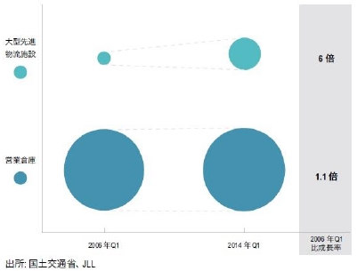 営業倉庫※1と大型先進物流施設※2のストック(床面積)を比較すると、2006年第1四半期の営業倉庫のストックは全国で約4,200万m2 であるのに対し、大型先進物流施設のストックは約120万m2 で営業倉庫ストックの3%に満たなかった。2014年第1四半期になると、営業倉庫ストックは2006年第1四半期比横ばいに近い1.1倍だったのに対し、大型先進物流施設のストックは6倍強と拡大している。それでも営業倉庫ストックと比較すると約15%に過ぎず、大型先進物流施設の拡大余地は大きく残っている。