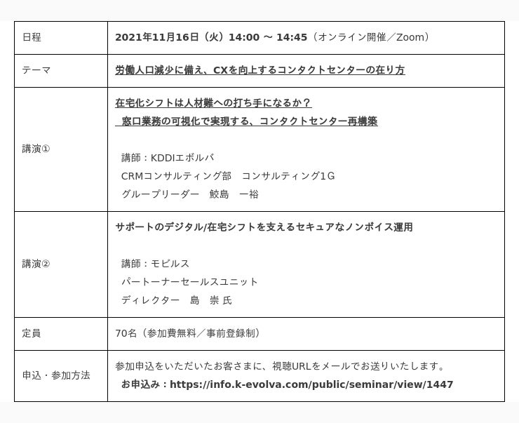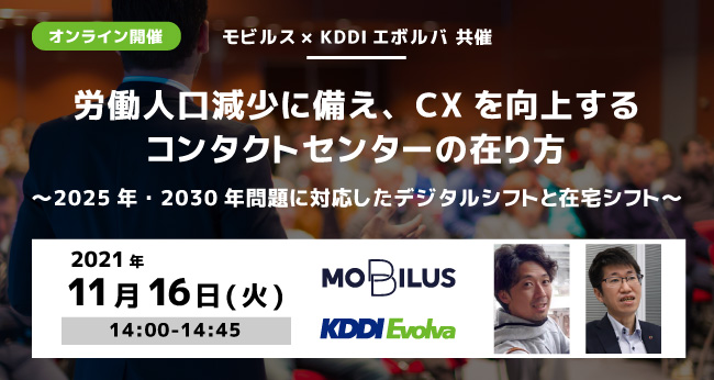 株式会社KDDIエボルバ(本社:東京都新宿区、代表取締役社長:若槻肇、以下KDDIエボルバ)は、モビルス株式会社(所在地:東京都品川区、代表取締役:石井智宏、以下モビルス)と『労働人口減少に備え、CXを向上するコンタクトセンターの在り方』と題したオンラインセミナーを2021年11月16日に開催いたします。