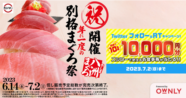スマートシェア株式会社(東京都渋谷区、代表取締役 西山 統 以下「当社」)は、株式会社あきんどスシロー(大阪府吹田市、代表取締役社長 新居 耕平)が展開するスシローのキャンペーンツールとして、当社が開発・運営するSNSマーケティングプラットフォームOWNLY(オウンリー)を活用したTwitterフォロー&リツイートキャンペーンが実施されたことをお知らせします。