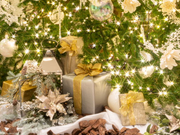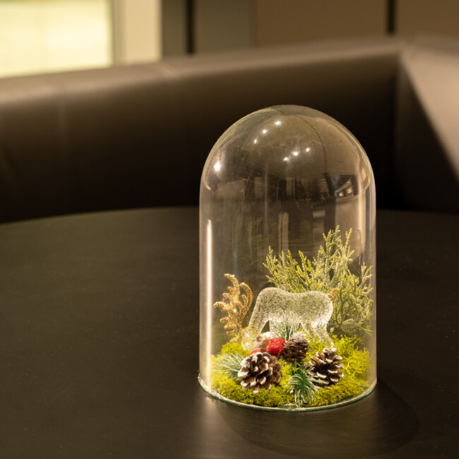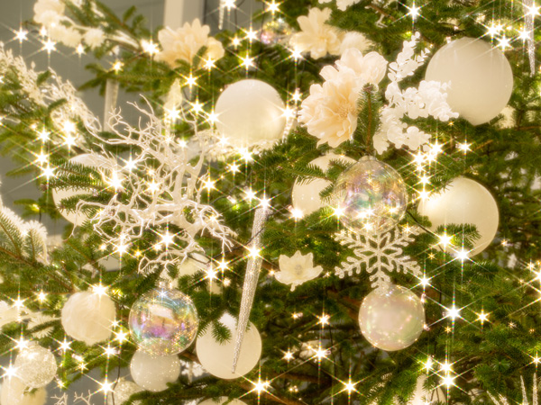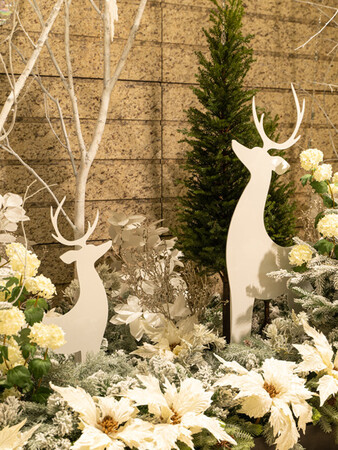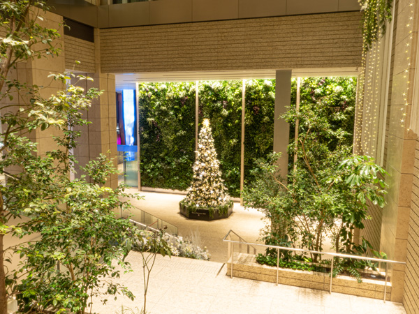 地下2階から地下1階へ向かう大階段付近は白銀の森をイメージした演出を施しました。既存の植栽とクリスマス装飾が引き立て合い、往来の際も冬の情景を感じていただける空間です。