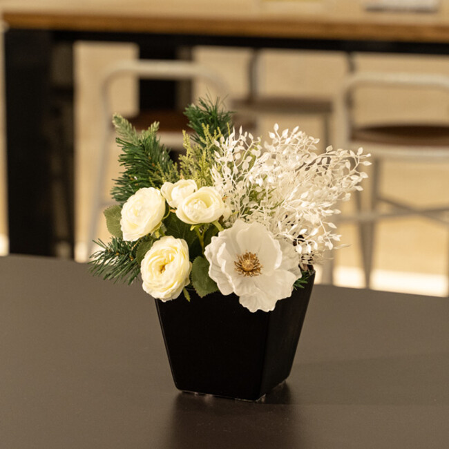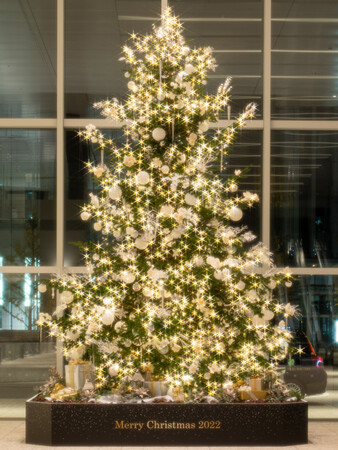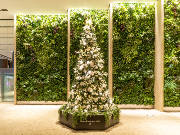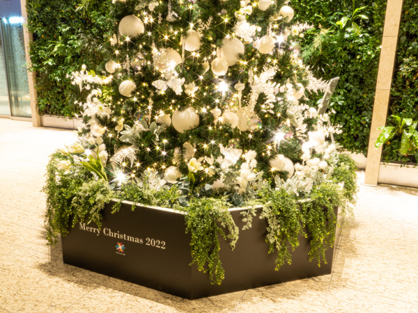 オフィス棟のロビーフロアには約7メートルの巨大なツリーを設置。白を基調にした花や葉のオーナメントを引き立てる、LEDのやさしい光がオフィスワーカーの心を癒すデザインです。総合エントランスやフリーテーブルにもツリーとイメージを合わせたアレンジメントを置いてクリスマスムードを演出しました。