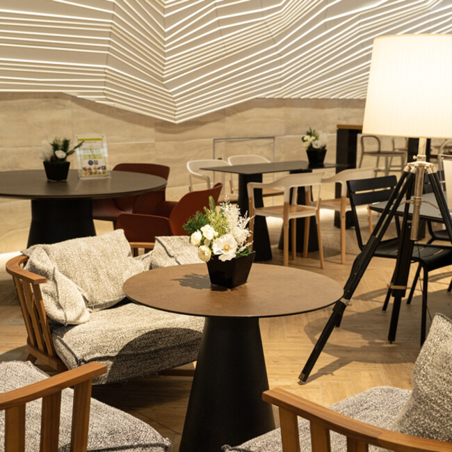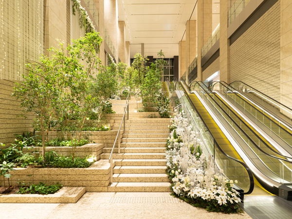 解放感がある吹き抜け空間のOtemachi One Avenueの地下2階には、今回のテーマを象徴するように、花や葉をふんだんに使用してデコレーションした約5メートルの大きな白いツリーを設置。瑞々しい壁面の植物を借景に、地下でありながらも自然を感じられるようなデザインです。