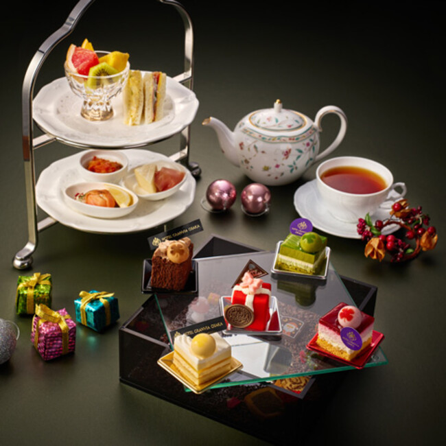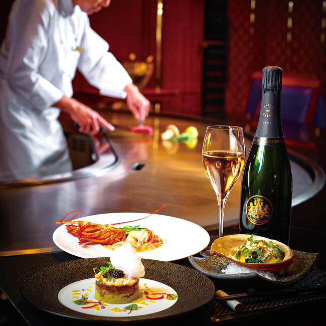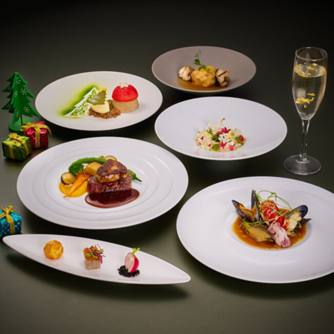 目の前で行う華麗なパフォーマンスが魅力の鉄板焼「季流」では、メインの極上黒毛和牛ステーキのほか、活伊勢海老・活鮑などもご堪能いただける極上コースに合わせて、極上のシャンパーニュと言われる「バロン・ド・ロスチャイルド」をグラスでご提供いたします。また、フレンチレストラン「フルーヴ」では、伝統的なフランス料理の「パテ・アン・クルート」や、彩り華やかな「オマール海老」を使用したメニューを楽しめるペアディナーをご用意いたします。魚介類やキャビアの塩味とも相性が良い、キリっとした後味のハーフボトルシャンパン「コント・ド・ブリモン」がセットになった大変お得なディナーコースです。また、ホテル1階の「ティーラウンジ」では、プレゼント型のケーキを添えた可愛いアフタヌーンティーセットでクリスマスムードを演出します。