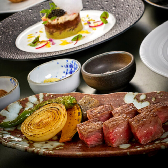 ズワイ蟹とマグロを使用した前菜から始まり、活伊勢海老や活鮑の鉄板焼、極上黒毛和牛ステーキを堪能する豪華なディナーコースです。