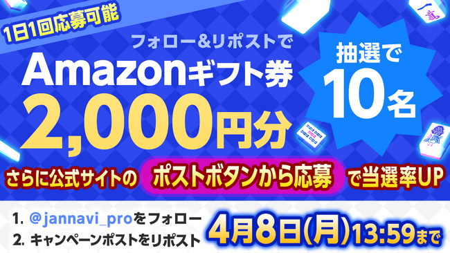 2024年3月29日(金)より4月8日(月)までオンライン麻雀アプリ「ジャンナビ麻雀オンライン」X(Twitter)公式アカウントにて抽選でAmazonギフト券2000円分を10名様にプレゼントするキャンペーンを実施致します。